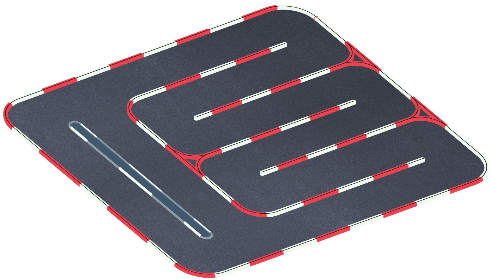 Благодаря большой площади и протяженности, нам удалось сделать трассу максимально широкой, безопасной и интересной. В конфигурации трассы присутствуют длинные прямые отрезки, скоростные и медленные повороты, шиканы и развороты на 180 градусов.
